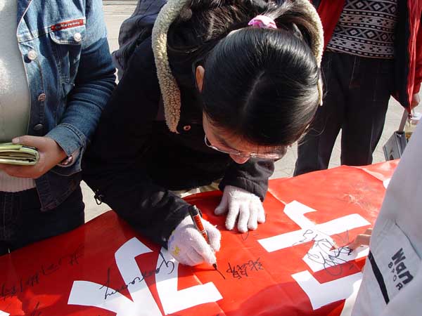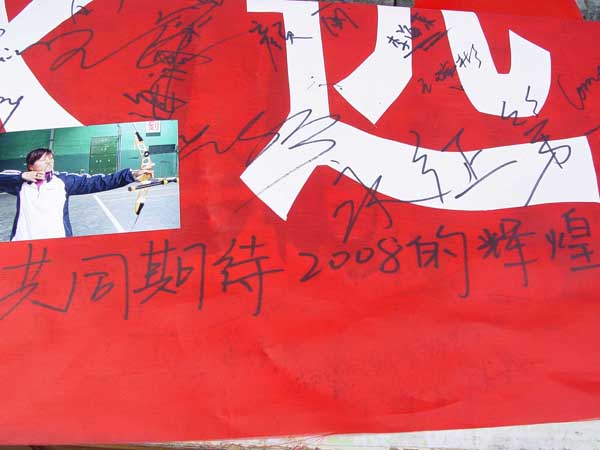 本站讯 2004年12月10日及11日中午,由校学生会举办的“支持校友张娟娟,支持国家女子团体射箭队”签名活动在鱼山校区三角地带举行。同学们在写有“张娟娟,你的同学永远支持你”的横幅上写下了自己的签名及真情寄语。据悉,此次的签名横幅将作为礼物于12月11日晚送给张娟娟及国家女子团体射箭队。