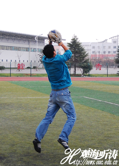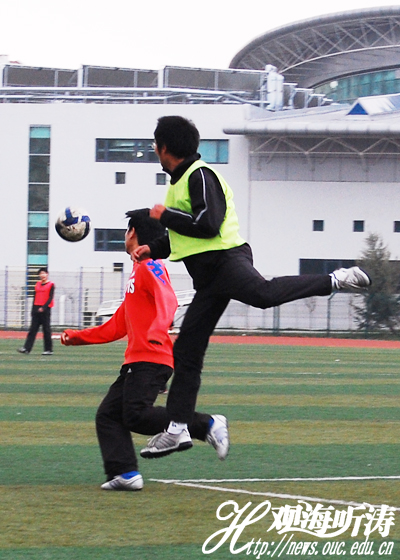 本站讯 12月10日,天空阴霾,崂山校区田径场上,崂山联队(身着红色球衣,以下代称红队)周游的一声怒吼撕裂了一片沉寂。他与队友康明红连续施展“踢墙配合”,一路杀入大禁区弧顶附近。与鱼山联队(身着绿色球衣,以下代称绿队)守门员单对单的他,沉着冷静,右脚劲射,足球以完美的弧线直钻球门死角。但这时裁判的哨声响起,这次有争议的越位裁决使周游前功尽弃,不禁抱憾呐喊。不过,红队最终凭借精诚的配合与猛烈的进攻,以2:0的显著优势战胜绿队,荣登精英杯足球赛总冠军宝座。