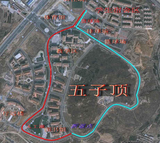 图为比赛路线图,田径场出发点→敏行西路→海源北路→海源西路→海源南路→海源东路→海源北路→敏行西路→田径场终点,女子组绕行一圈,男子组两圈。