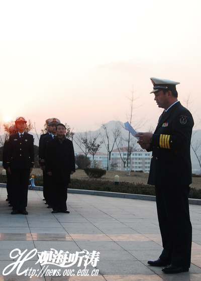 本站讯2010年的第一缕阳光抚过一张张刚毅的面庞,照在鲜艳的五星红旗上。1月1日清晨,在校国防生在行远楼前举行盛大的升旗仪式。党委武装部李春雷部长,海军选培办曲凤桐主任、毛磊军干事、宋大千干事出席该升旗仪式。