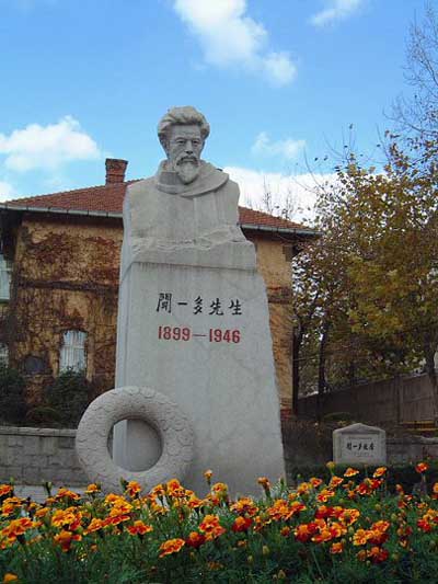 弯入校园的西北角,另一座欧风建筑映入眼帘,年代更迭,楼身更显沧桑,但是爬满墙壁的藤蔓依旧葱郁,而且见证了它经历过的岁月洗涤,这里就是著名的“一多楼”——闻一多先生故居。粗犷的花岗石墙壁缠满树藤,红色筒瓦覆顶,狭长的拱门一样的窗口饰以美丽的西式图案浮雕,楼内布局至今完好保留原有格局,显得既古朴典雅,又不失异国情调。在楼前花坛正中竖立着闻一多的半身大理石雕像,座上的碑文是他的学生臧克家撰写的;在花坛两侧还有两棵雪松像是两个守护神,护卫着这个拍案而起的文豪。