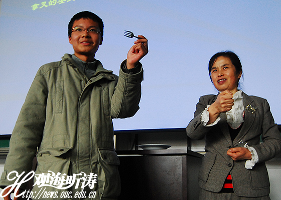 在接下来的讲座中,慎丽华着重介绍 “餐饮礼仪”。她就中餐与西餐中人们应有的规范礼仪作讲解,并着重强调中西餐中的禁忌。为了让同学们印象深刻,慎丽华请几名现场的同学到讲台前表演如何使用西餐的工具。在慎丽华细心教导下,几名同学都举止规范地使用起西餐刀叉。在其他就餐细节中,她讲解 “自助餐”的注意事项以及酒水与菜肴搭配问题等。