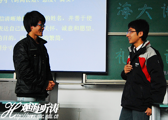 慎丽华首先讲授交往的中心原则“三A原则”。她强调“接受accept”、“重视appreciate”、“赞美admire”是人际交往中必须要回响在脑海里的三个基本点。接下来她从“称呼”、“介绍”与“握手”三个方面为大家做基本礼仪介绍。为了让同学们体会到良好的礼仪规范,她请场下的同学与她互动,热情的化学2008级李爱龙与化学2009级丁剑为大家表演“自我介绍”。慎丽华指出良好的规范礼仪是成功的第一步。针对“介绍”方面,她还点出介绍人作介绍时应多使用敬语,比如“这位是……”。“握手”部分,她则从时机、次序与方式三个方面入手强调规范与禁忌。在这一部分的最后,她还向在座同学介绍社交场合中必不可少的“名片”以及其功用。