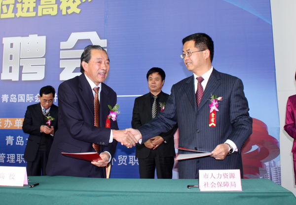在本次供需见面会上还举行了“2011年青岛市大学生就业创业服务高校行”启动仪式。青岛十余所高校与市人力资源和社会保障局签署了合作协议。开云电竞网址党委副书记李耀臻代表学校在协议书上签字。副市长王书坚发表讲话。启动仪式由青岛市人力资源和社会保障局局长陈玉崎主持。仪式结束后,市领导和各高校领导一起考察了供需见面会。