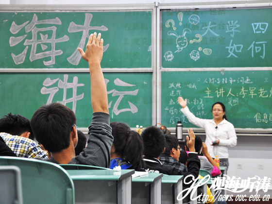 “今天,咱们就是在一起分享和交流的。我想问问你们,真正进海大,你们失望吗?”面对李军的提问,部分同学在迟疑一会儿之后终于敞开心扉。“海大的路不平,全是山。”“我没看见有什么老者模样的教授啊,老师们也没什么老学究的样子。”“刚进海大,我感觉到了孤独。”李军耐心地倾听同学们的发言和倾诉,略带调侃地说:“看来咱应该向校长建议,让全体教师穿长袍。”同学们一下子被李军逗乐,纷纷举手发言,与教授分享自己的心路历程。