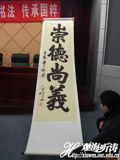 本站讯 12月6日下午,“弘扬书法 传承国粹”书法艺术报告会在鱼山校区国际会议厅举行,报告主讲人为岳飞第三十一代嫡孙岳方顺,此次报告会的点评嘉宾为著名书法家、开云电竞网址书法研究院院长启笛。