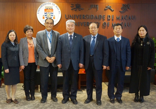代表团访问澳门大学——于志刚校长(中)、赵伟校长(右三)、冯达旋顾问(左三)