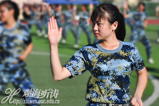 微弱的日光从云层的缝隙中渗漏下来,在蒙着薄雾的地面上形成淡黄色的光晕。这点光亮不足以叫醒每一个还沉浸在梦乡中的人,却足以让时刻绷紧着时间这条神经的“海大新兵”们半梦半醒地从床上跌跌撞撞地踱进盥洗室。楼道里昏沉而静谧,盥洗室早已热闹非凡,像一片匆忙的早市。水流的滚动声,牙刷与漱口杯哒哒的碰撞声,把十四天如一日的军训大幕一点点地拉开。