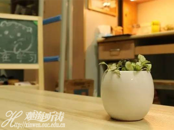 在熟人的眼中,这间“227”是典型的“别人的宿舍”,一角一落都带着精心布置的痕迹——抬眼望去,舒适的海绵地板铺陈开来,掩去了瓷砖的冰冷;暖色调的墙纸与台灯给房间增添了一丝暖意,小巧的茶几立于中间,各种盆栽、小黑板、装饰品,在合理的布局下构成了这片温馨的天地。时间回溯到去年九月,面对着空旷得有些冷清的宿舍,刚刚脱离军训苦海的苏家琛和室友们便迫不及待地给地面铺上了海绵地板。“其实最初只是想着铺上地板后,夏天可以在上面躺着睡觉,或是席地而坐,就是图个自在,根本没想到要买那么多东西。结果铺完之后,总觉得还是少了点什么,我们便又到网上买了个茶几。”