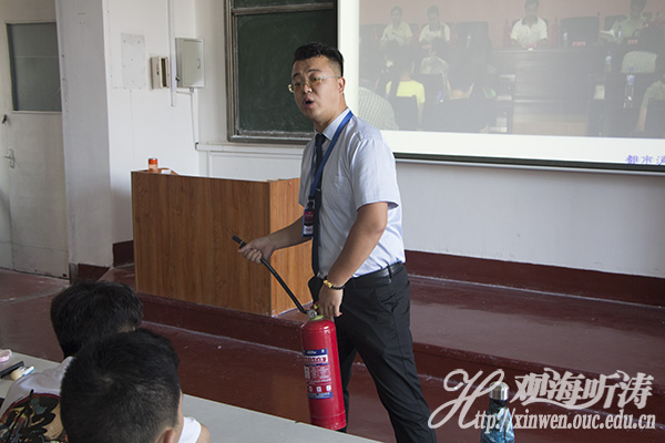 接下来,佟雪林主任采用互动交流的方式,将校园生活中易造成火灾的原因、安全用电常识及电气火灾预防、常见火灾及处理方法、火场逃生自救方法和灭火器的使用等消防知识贯穿其中,极大的调动了现场气氛和学生对学习掌握消防安全知识技能的积极性,使同学们对消防安全知识技能有了直观、深刻的印象。佟雪林主任强调要正确理解基础消防安全知识,例如发生重大火灾时拿湿毛巾捂住口鼻实际作用不大,因为浓烟中大部分都是不溶于水的一氧化碳,在这种情况下,要使用防毒面具才能起到防护效果。针对研究生同学,佟雪林主任提出了降低火灾风险的小建议:晚上睡觉的时候不可以通宵给手机充电,一个插排上不可以同时插太多大功率电器,电器起火时要拿灭火器进行灭火而固体起火时要拿水来灭火等。
