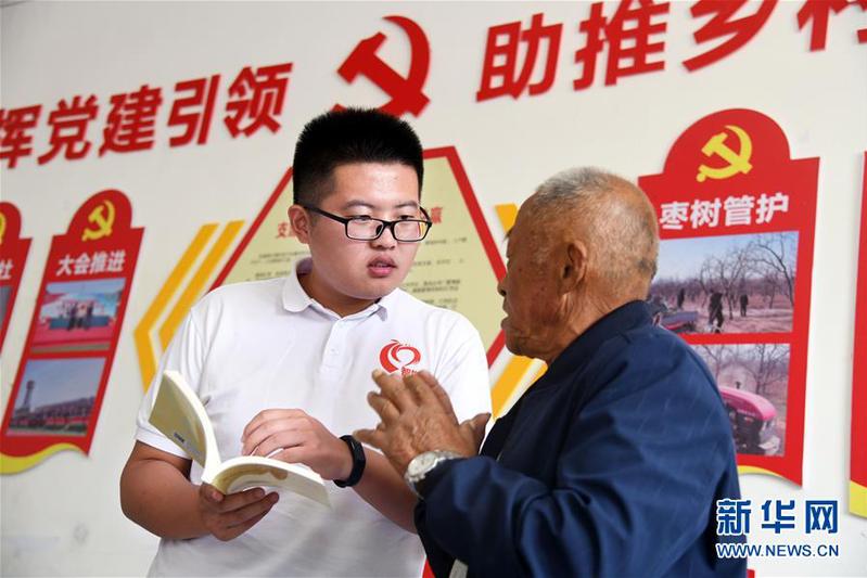 博士团成员李扬(左)在与结成智援帮扶对子的朱集镇大常村村民崔岐华交谈