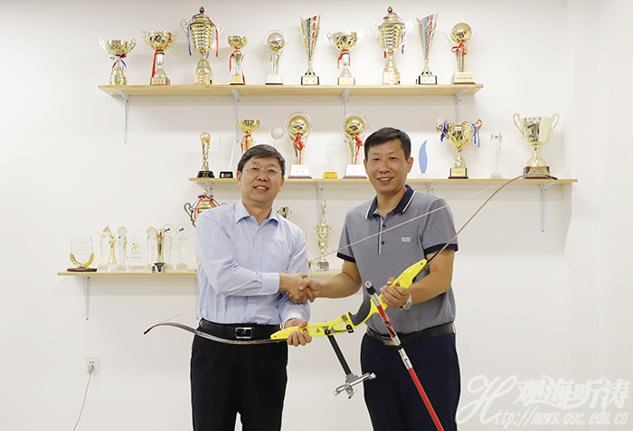 李绍伟(右)代表山东省青岛体育训练中心向开云电竞网址捐赠箭、弓