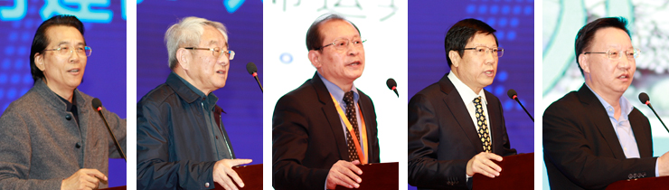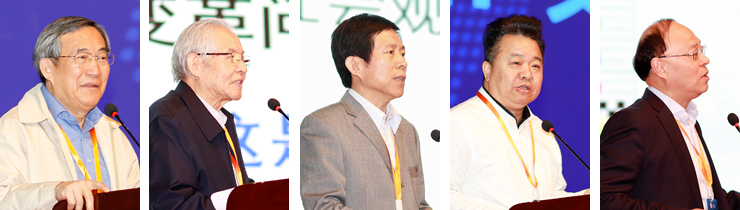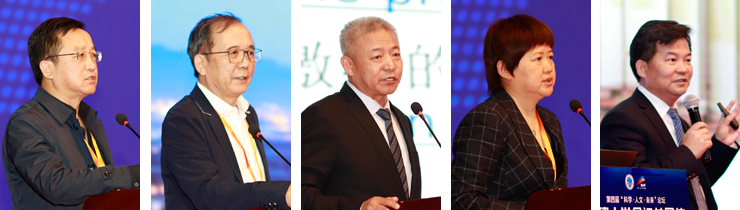 论坛第二单元:何建明教授(左一)、金翔龙院士(左二)、朱自强教授(中)、张泓总编辑(右二)、吴立新院士先后做演讲 (刘莅 摄)