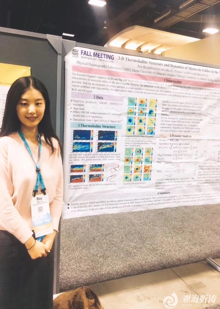 研究生阶段,胡柔一边认真学习拿着学业奖学金,一边在导师安排下早早地和美国伍兹霍尔海洋研究所教授保持良好的学术联系。随之抱着增长见闻寓游于乐的心态主动提出赴美参与AGU 2018 Fall Meeting,报名后投入整个2018年春天为此作准备,长长计划缓慢向前推进。