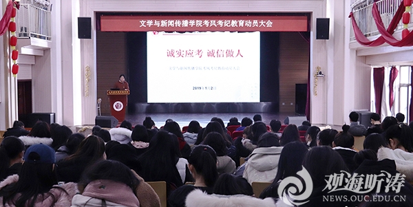 本站讯 1月2日,文学与新闻传播学院在文新楼乐海堂(408室)举办考风考纪教育动员大会,学院党委副书记、副院长吉晓莉,团委老师许春颖及2019级全体本科生参加了本次大会。