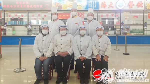 抗“疫”期间,坚守岗位的崂山校区第一食堂7人小组(前排从左至右:王光霞、姜雪梅、裴亚利、马圣叶,后排从左至右:高明亮、李玉全、王玉杰)