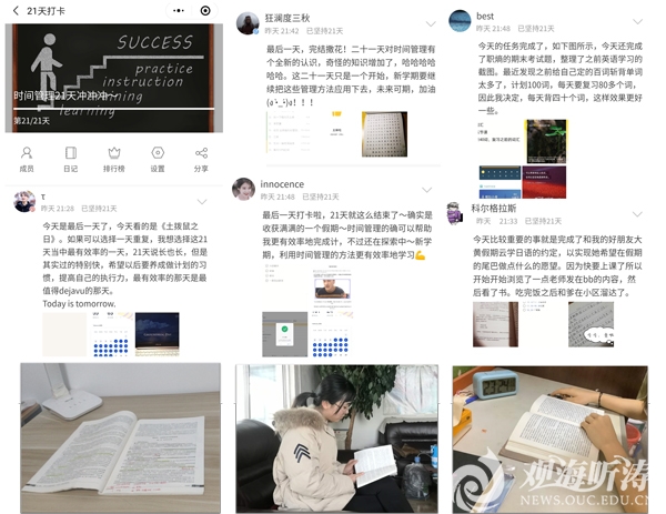 2019级会计学(ACCA方向)专业杨林晔表示:原计划寒假开展的关于心理问题的社会实践调研无法进行,这个训练营刚好设计了线上人物访谈的实践模块,这启发我们联系众多高校心理专家进行在线采访,采访过程中我们不仅收获了心理知识,也锻炼了交流沟通和组织能力,我也会把线上采访的稿件通过课程平台分享给更多同学,让同学们以更加积极健康的心态战胜疫情。身在湖北武汉的2018级会计学专业邓诗影表示:24天的训练营课程冲淡了我对疫情蔓延的焦虑情绪,在家中也能与熟悉的老师、同学一起学习让我倍感亲切和温暖,通过训练营的学习训练,我在沟通、写作和时间管理方面有很大收获,相信疫情终将结束,期待以更加充实的自己与同学们在春暖花开的校园重逢。