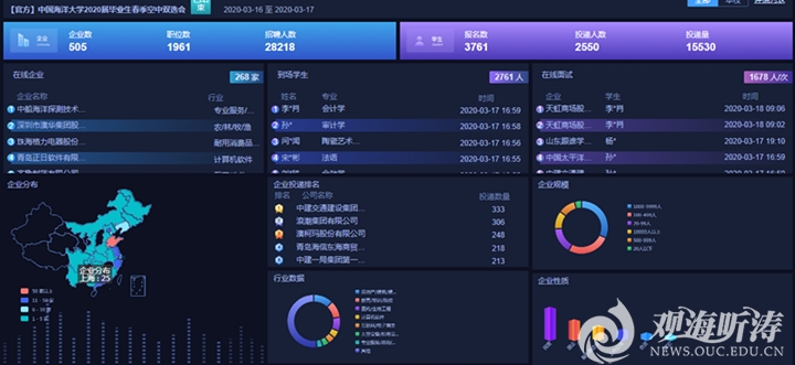 据悉,根据学校2020年毕业生就业工作的总体安排,此次双选会是学校在疫情防控形势下首次将每年度的毕业生春季大型供需见面会采用线上模式举办,也是保障疫情期间毕业生顺利求职的重要举措之一。此次双选会规模大、匹配性强,参会单位覆盖全国24个省(市区)、63个行业,为毕业生提供就业岗位28218个,招聘需求覆盖学校大部分学科、专业;参会单位层次比较高,其中国有企业107家,股份制企业71家,上市企业52家,包括华为、中国建筑、中国移动等世界500强企业,中兴、中国一汽、中国中车等国家重点领域企业,美的、格力、潍柴动力等行业龙头企业。为保障首次大规模空中双选会的质效,学校自3月2日启动筹备,多措并举地多渠道邀请重点用人单位参会;双选会期间,及时跟踪后台数据分析学生在线求职轨迹,邀请简历指导专家进驻,开设“简历门诊”,为毕业生提供指导和服务。