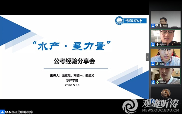 本站讯 5月30日上午,为帮助同学们提前做好职业规划,提升求职信心,由水产学院团委主办、2017级水产养殖学一班承办的“水产星力量”公考经验分享交流会通过腾讯会议举办,水产学院辅导员、3位优秀毕业生代表参会,会议由辅导员杨正主持。