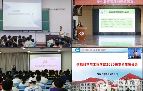 线下集中教育主要在新生报到后3天。根据疫情防控要求,各学院(中心)分别组织开展了开学典礼、专业导航与选课指导、开学第一课、管理制度宣讲、主题班会等活动,促进新生与学校老师、学长及新生之间的互动交流,帮助新生快速融入大学生活。信息科学与工程学院、文学与新闻传播学院等学院召开了新生家长线上见面会,架起了学校与家长沟通的重要桥梁,促进新生家长对学院基本情况和学生在校学习生活有了更充分的了解,为2020级本科生的教育管理工作奠定了坚实基础。