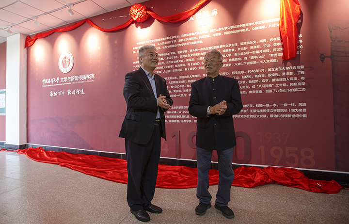 于志刚校长(左)与王蒙先生共同为文学与新闻传播学院院史文化长廊揭幕