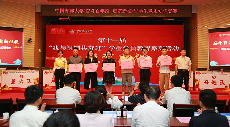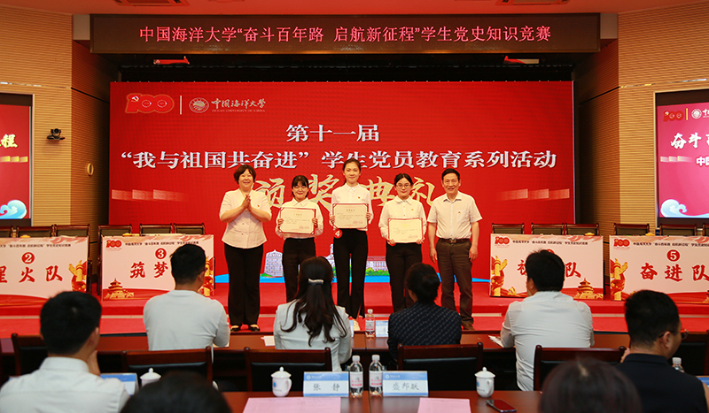 本站讯 为在学生群体中深入开展党史学习教育,由党委学生工作部主办,化学化工学院党委承办的开云电竞网址“奋斗百年路 启航新征程”学生党史知识竞赛暨第十一届“我与祖国共奋进”学生党员教育活动颁奖典礼于6月19日在崂山校区举行。教育部党史学习教育高校第八巡回指导组副组长盛邦跃,指导组成员吴峰、孙寅林全程观摩了比赛。校党委常务副书记张静,党委常委、校长助理吴强明出席活动。