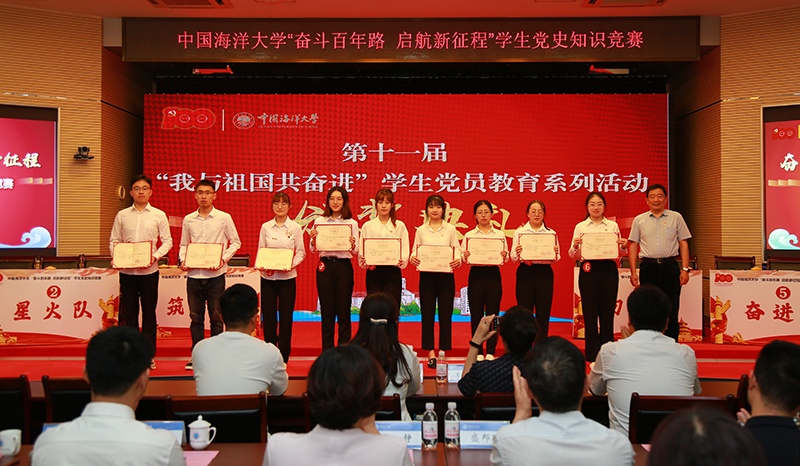 颁奖典礼环节,通过视频回顾了学校学生党史学习教育的整体情况,总结了本届“我与祖国共奋进”学生党员教育活动开展情况。现场公布了“党史知识知多少”网上答题活动获得优秀奖的50名同学名单,并为党支部风采海报展示征集活动、学生党史知识竞赛的获奖同学颁发了获奖证书。环境科学与工程学院党委、管理学院党委、经济学院党委、外国语学院党委、法学院党委、数学科学学院党委获得优秀组织奖。
