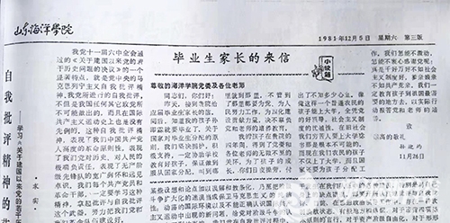 40年前的今天,1981年12月5日,校报《山东海洋学院》登载了我父亲孙迎灼写给学校的家长来信。来信不长,通篇没有华丽词藻,没有豪言壮语,朴实的文字中充溢着他的家国情怀和他对党、国家与学校的感恩。现在读来,我还是感慨不已,感动不已。