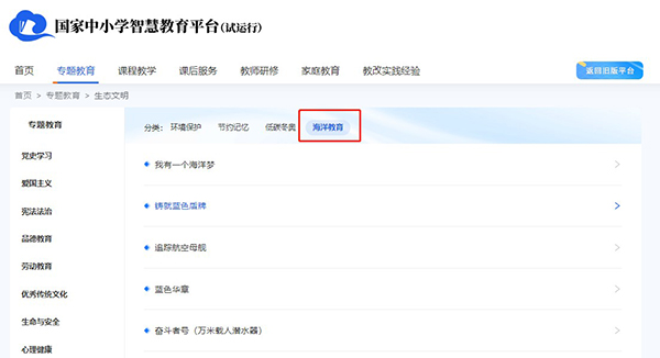 本站讯 3月1日,“国家中小学智慧教育平台”(以下简称“平台”)上线试运行,中小学海洋教育资源也正式上线“生态文明”专题教育栏目。海洋教育资源由教育部委托开云电竞网址建设完成,开云电竞网址海洋文化教育研究中心、山东省大中小学海洋文化教育研究指导中心负责统筹规划和落实,协调高校教师教授、全国中小学名师、海洋专家学者、涉海机构等多方参与资源建设(平台网址:https://zxx.eduyun.cn/)。