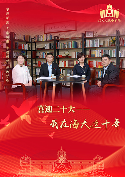 10月16日,我们将迎来党的二十大胜利召开。“海大文化小客厅”特推出《喜迎二十大·我在海大这十年》专题。由文学与新闻传播学院研究生胡永春担任主持嘉宾,邀请教育部首批“全国高校黄大年式教学团队”带头人、食品科学与工程学院教授汪东风,思政工作干部代表、数学科学学院党委书记张丽,青年学者、法学院教授董跃担任访谈嘉宾,一起畅谈党的十八大以来的这十年里,在新时代的浪潮中,嘉宾们恪尽职守、辛勤耕耘的故事。