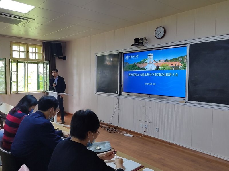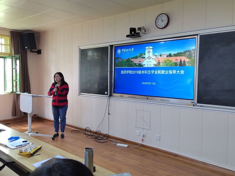 本站讯 5月19日下午,医药学院2019级本科生学业和就业指导大会在地质馆300举行。医药学院党委书记王震、党委副书记孙娜、2019级药学2班班主任王鹏、特邀嘉宾李明、李国云、王庆娟和药学2019级全体同学参加了此次会议。会议由团委书记、2019级带班辅导员赵炜老师主持。