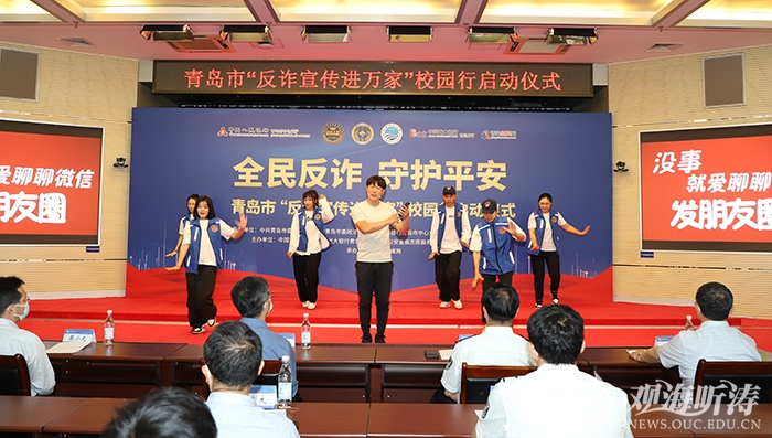 活动现场,亮点纷呈。青岛公安金盾志愿服务队队员们,表演了原创文艺作品《反诈阵线联盟》,通过幽默风趣的说唱形式,展现了服务队打击治理电信网络新型违法犯罪、为民挽回损失所取得的骄人成绩。光大银行青岛分行员工结合身边的真实案例,自编自演了反诈小品《拒绝倒卖银行卡》,在轻松诙谐的氛围中宣传反诈知识。本次活动还专门在场外设立了反诈宣传点,为同学们发放反诈宣传资料,讲解反诈知识。