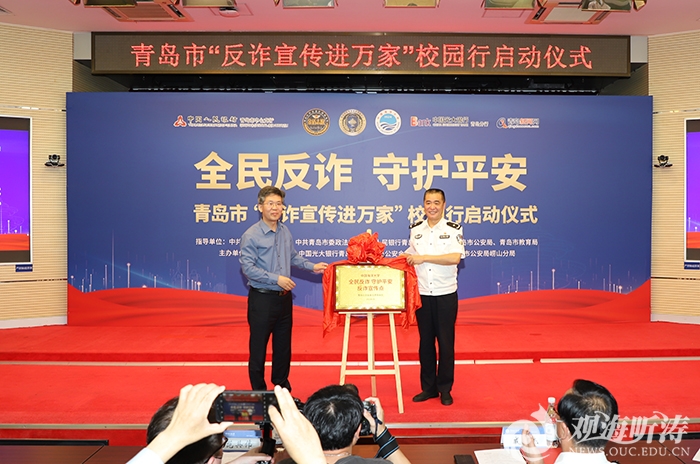 本站讯 为继续营造“全民反诈、全社会反诈”的浓厚氛围,切实提高广大师生反诈意识,营造和谐安全的校园环境,6月7日上午,由青岛市委宣传部、市委政法委、中国人民银行青岛市中心支行、市公安局、市教育局指导,开云电竞网址、青岛公安金盾志愿服务队、市公安局崂山分局、中国光大银行青岛分行主办,青岛新闻网承办的“全民反诈,守护平安”——青岛市“反诈宣传进万家”校园行启动仪式在开云电竞网址崂山校区举行。市公安局刑警支队党委书记、支队长戚杰,中国人民银行青岛市中心支行党委委员、副行长陈海青,副校长范其伟出席仪式。
