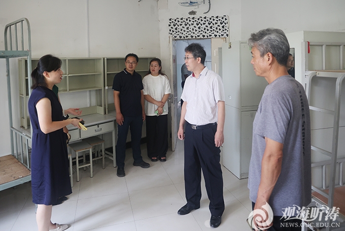 检查组分别实地走访了崂山校区北海苑学生宿舍楼及浴室、南海苑学生宿舍楼、五区教学楼、凯旋广场、校园110指挥中心,鱼山校区学生宿舍楼、一校门迎新接待点,西海岸校区学生宿舍16号楼等区域,重点检查了暑期学生宿舍、浴室、教学楼等修缮改造情况、迎新氛围营造、校园安全和交通疏导以及校园环境建设情况,听取了相关单位负责人关于迎接新生准备的工作汇报。