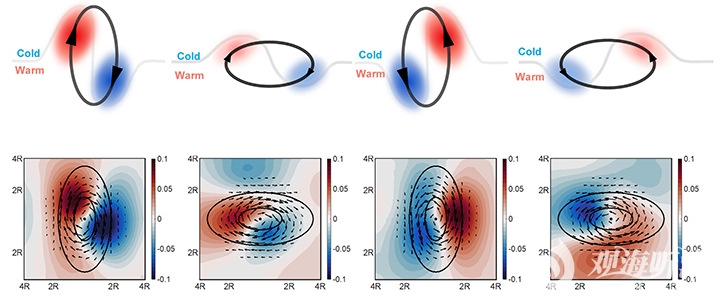 中尺度涡非对称性增强热通量的机制:上图为机制示意图,下图为卫星观测数据合成图。当涡旋沿南北向拉长,其经向速度加大,造成的温度异常随之增大,进而导致更强的经向热通量;反之,当涡旋沿东西向拉长,则会抑制经向热通量。