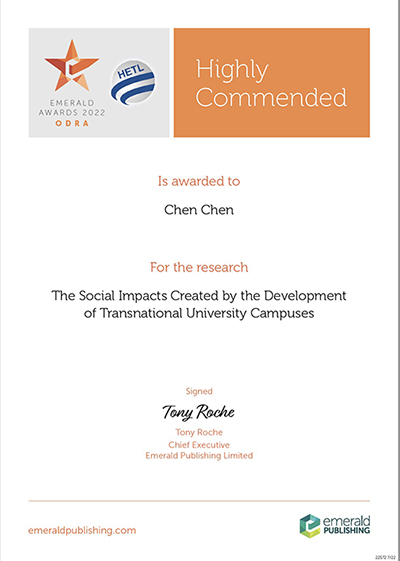 在获此奖项之前,陈琛老师的论文成果“Transnational universities, host communities and local residents: Social impacts, university social responsibility and campus sustainability”(跨国大学、社区与居民:社会影响、大学社会责任与校园可持续性)当选为Emerald在2021年的唯一一篇全球推广论文,形成了一定的国际影响力。