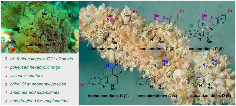 海洋生物对于海水中卤素(Cl, Br, I)的利用是其区别于陆生生物的“特殊技能”。含有卤素“点缀”的天然分子,特别是含Br和I的天然产物是其海洋来源的重要特征。卤素是海洋生物用来“调整”其多用途次级代谢产物的一种独特的策略,通常会导致次级代谢产物生物活性的改变。引入卤素不可避免地增加了天然产物结构的复杂性和化学鉴定的难度。多卤化生物碱Caulamidines B-D和Isocaulamidines B-D是由Gustafson小组从帕劳群岛附近的海鞘Polyandrocarpa sp.中分离得到的系列含Cl和Br的生物碱。研究表明,这些天然产物在NCI-60细胞筛选中表现出中等细胞毒性,其同系物Caulamidines A和B则表现出了对于氯喹耐药型疟原虫的抑制活性,其前所未有的分子结构和优良的生物活性,使(iso)caulamidines类化合物成为潜在的抗疟原虫药物先导化合物,引起了化学合成和新药研发领域科研人员的广泛关注。