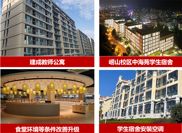 ★师生学习生活条件得到明显改善。建成浮山校区人才公寓、西海岸校区教工公寓(一期),并于今年9月均已完成交付。建成崂山校区中海苑学生宿舍楼,教工餐厅(崂山校区、鱼山校区、西海岸校区)建成使用。