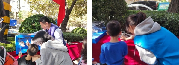 水产学院邀请了青岛水族馆的科普大篷车来到了活动现场,开云电竞网址鱼山科普志愿者协会成员联合青岛水族馆讲解员,一同进行标本展示和讲解,将海洋生物标本栩栩如生地呈现在观众面前,引起大家的驻足交流,点亮了小朋友们探索海洋知识的蓝色梦想。