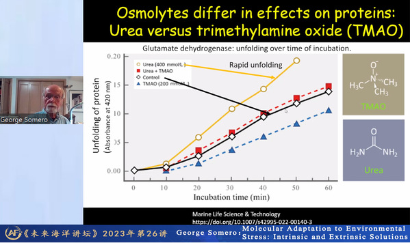Somero首先介绍了海洋生物的生存面临着来自环境的多重压力,包括但不限于极端温度、渗透压差异和静水压力,这些压力是生物维持体内生物大分子的结构和功能的极大挑战,海洋生物通过多种适应性机制成功应对了这些环境挑战。其中,两种主要的适应性机制由“内”(例如蛋白质序列的变化)而“外”(即细胞液溶质“渗透剂”组成的改变)地权衡大分子的刚性和柔性,以适应其所处的环境。Somero指出,生活在不同环境条件下的生物具有不同结构和稳定性的蛋白质,在某些情况下,甚至一个氨基酸的改变已足以使生物适应更加严峻的环境。Somero进一步讲解了由细胞渗透剂组成改变形成的适应性机制,指出这种适应性变化在海洋生物是广泛存在的,并强调在海洋生物中这种渗透剂组成的适应性变化在应对环境压力的短期表型驯化和长期进化适应中起着关键作用。这种以渗透剂变化为主导的生物适应机制的研究对于在生命科学领域设计能够维持生物大分子结构稳定性的人工基质具有积极的指导意义。