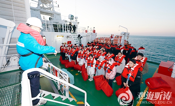 师生们观看宣传片,参观驾驶室、生活区和实验作业区,深入了解“东方红3”船,领略全球最大的最高静音等级科考实习船的风采。“东方红3”船实验室老师讲授了海洋水文、海洋气象、海洋生物、海洋化学、海洋地质等海洋调查方面以及船载先进海洋调查仪器设备的相关知识,带领师生们现场观摩CTDConductance Temperature Depth,温盐深测量仪)探测与样品采集全过程,学习逃生技能并开展弃船求生演习。课程坚持思想价值引领,每个航次均融入“海洋强国与伟大复兴”系列思政内容,师生同上一堂航行中的思政课;融入体育教育,依托船上健全的体育设施,开展体育锻炼;融入劳动教育,餐厅和住舱等区域的卫生由学生负责维护,养成爱护公物、热爱劳动的良好习惯。在“东方红3”船上的认知实践的学习内容深刻而丰富,具有较强的理论性和实践性,实现了德智体美劳“五育”并举。
