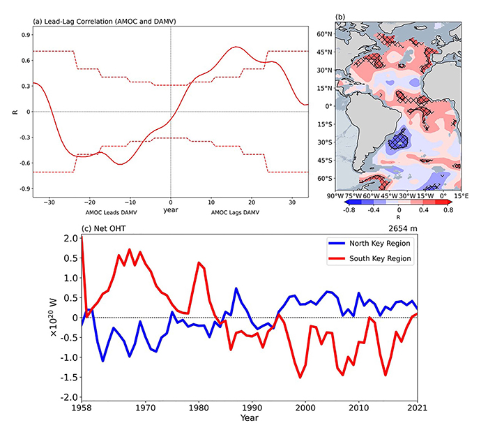 图2:大西洋深海多年代际变率(DAMV)与大西洋经向翻转环流(AMOC)的关系。(a) 超前滞后相关图;(b) AMOC超前深海海温13 年的相关分布图;(c) ACCESS-OM2 模式中DAMV两个关键区的深层经向热输送随时间变化图。
