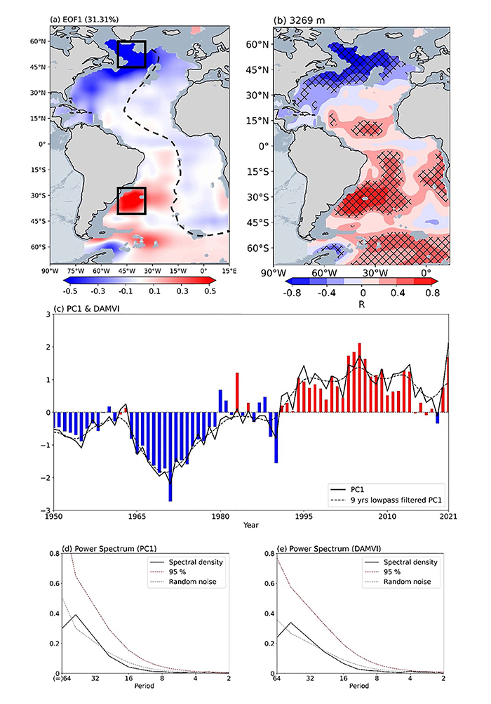 图1:大西洋深海多年代际变率(DAMV)的时空特征。(a) EOF1空间分布;(b) DAMV指数与3269m深海海温场的相关分布;(c) 时间演变特征:PC1(曲线)和DAMV指数(柱)指标的时间序列;(d) PC1的功率谱结果;(e) DAMV指数的功率谱结果。
