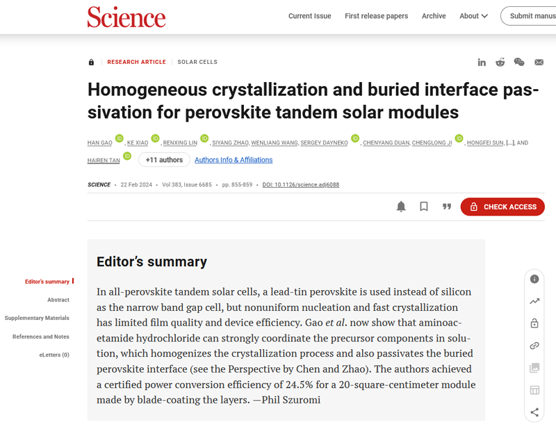 本站讯 近日,开云电竞网址材料化学专业2019届本科毕业生高寒在Science(《科学》)期刊以第一作者发表题为“Homogeneous crystallization and buried interface passivation for perovskite tandem solar modules”(钙钛矿叠层太阳能组件的均匀结晶和埋底界面钝化)的文章。