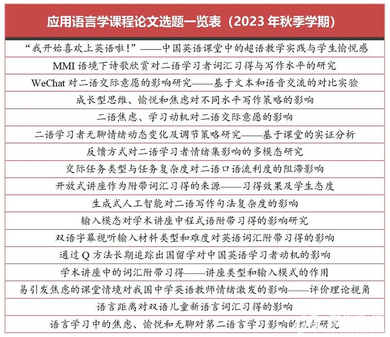 “国际性”和“前沿性”是本课程授课内容的定位。为此,我综合对比了剑桥大学、牛津大学、爱丁堡大学和加利福尼亚大学洛杉矶分校的相关课程,构建了以应用语言学基本理论和当前国内外研究成果为载体的课程体系。本课程的一大亮点是通过引入国际期刊论文、学术著作、在线资源等,让学生了解国际最新的研究成果和思想。在课程设计阶段,我有意选取了ChatGPT、大语言模型、自然语言处理等前沿话题,融入国际前沿理论、方法和案例。通过与国际前沿研究的亲密接触,让学生开阔视野,提升专业兴趣。