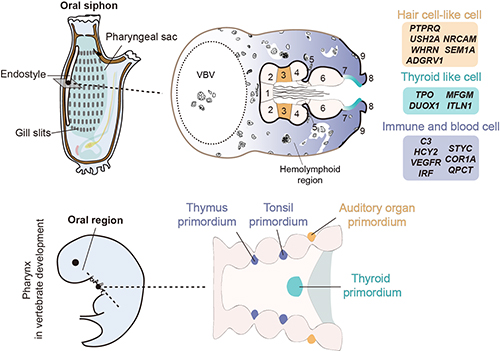 图3. 海鞘内柱器官与脊椎动物胚胎咽部器官的比较。上半部分左侧是成体海鞘内柱,右侧是内柱的横截面,包括对称分布的九个致密组织区以及本研究新发现的类血淋巴疏散组织区域。海鞘内柱第3区细胞类群与脊椎动物内耳-侧线系统中的毛细胞存在基因表达特征上的高度相似性;内柱类血淋巴组织区域可能为脊椎动物血液系统及淋巴系统的演化早期模式;内柱第7区的类甲状腺细胞群与脊椎动物甲状腺细胞同源,并具有逐渐成熟的发育变化特征。