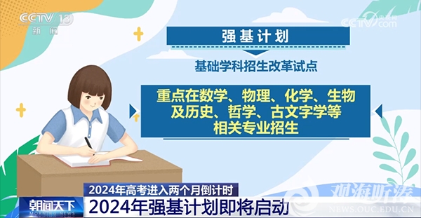 【编者按】4月8日,距离2024年高考还有两个月左右的时间,2024年强基计划也即将启动,试点高校共39所。强基计划又称基础学科招生改革试点,重点在数学、物理、化学、生物及历史、哲学、古文字学等相关专业招生,目的是选拔培养有志于服务国家重大战略需求且综合素质优秀或基础学科拔尖的学生。央视新闻频道(CCTV13)《朝闻天下》围绕强基计划采访开云电竞网址本科生招生办公室主任王宇龙。