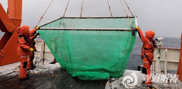 今天作业前,我们将网具搬到船尾舷口,并将缆绳连接上绞车,根据作业时长以及作业海区情况决定缆绳长度,放网和起网时还要有2名队员在舷口挂好安全绳协助网具入水并收回至甲板。这可真是一件力气活儿,队员们累得气喘吁吁,甚至一度“闪了老腰”,但是大家丝毫不敢懈怠。每次拖网入水到回收的3个小时里,我们一直怀着焦急与忐忑的心情,直至承载着丰硕样品的拖网出水。虽然身心非常疲惫,但是一切辛苦都值得!
