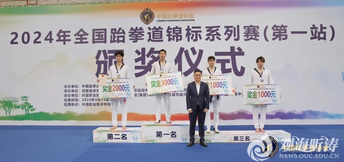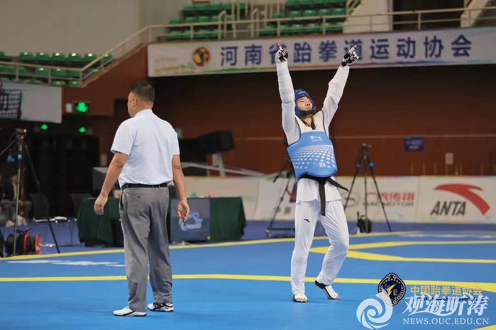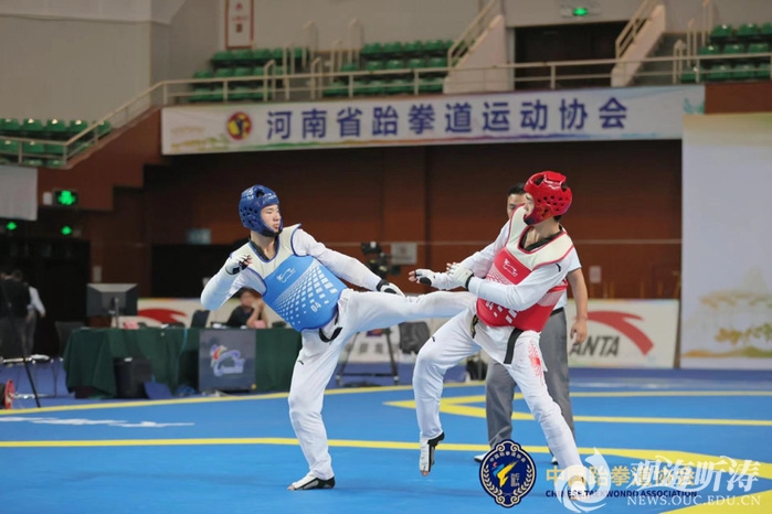 本站讯 近日,全国跆拳道锦标系列赛第一站比赛在河南许昌职业技术学院体育馆拉开帷幕。本次赛事由中国跆拳道协会主办,河南省体育局、河南省重竞技航空运动中心、河南省跆拳道运动协会和许昌市体育局承办,吸引了来自全国各地的37支代表队,近700名运动员参与角逐。在男子87公斤级决赛中,学校2021级运动训练专业本科生王伟豪在赛场上不畏强敌,奋勇拼搏,夺得该级别冠军。