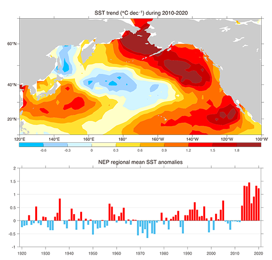 图1. 上图:2010-2020年SST趋势(单位:°C/decade)。(下图)东北太平洋(160°W-120°W,40°N-60°N)SST相对于全球平均温度异常的时间序列(单位:°C)。气候态为1950-2000年。